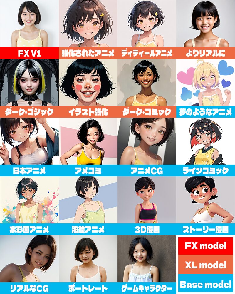 同じプロンプトを使用して、各モデルで画像を生成した結果が以下になります。