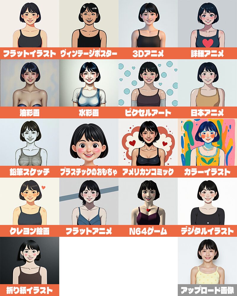 同じ画像に各スタイルを適用した結果が以下になります。