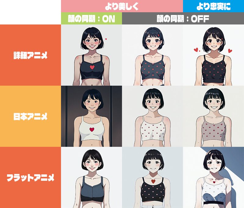 顔の同期ON/OFFは確かに顔が変わっているのがわかるのですが、より美しく/より忠実にについては何が違うのか正直わからないです。