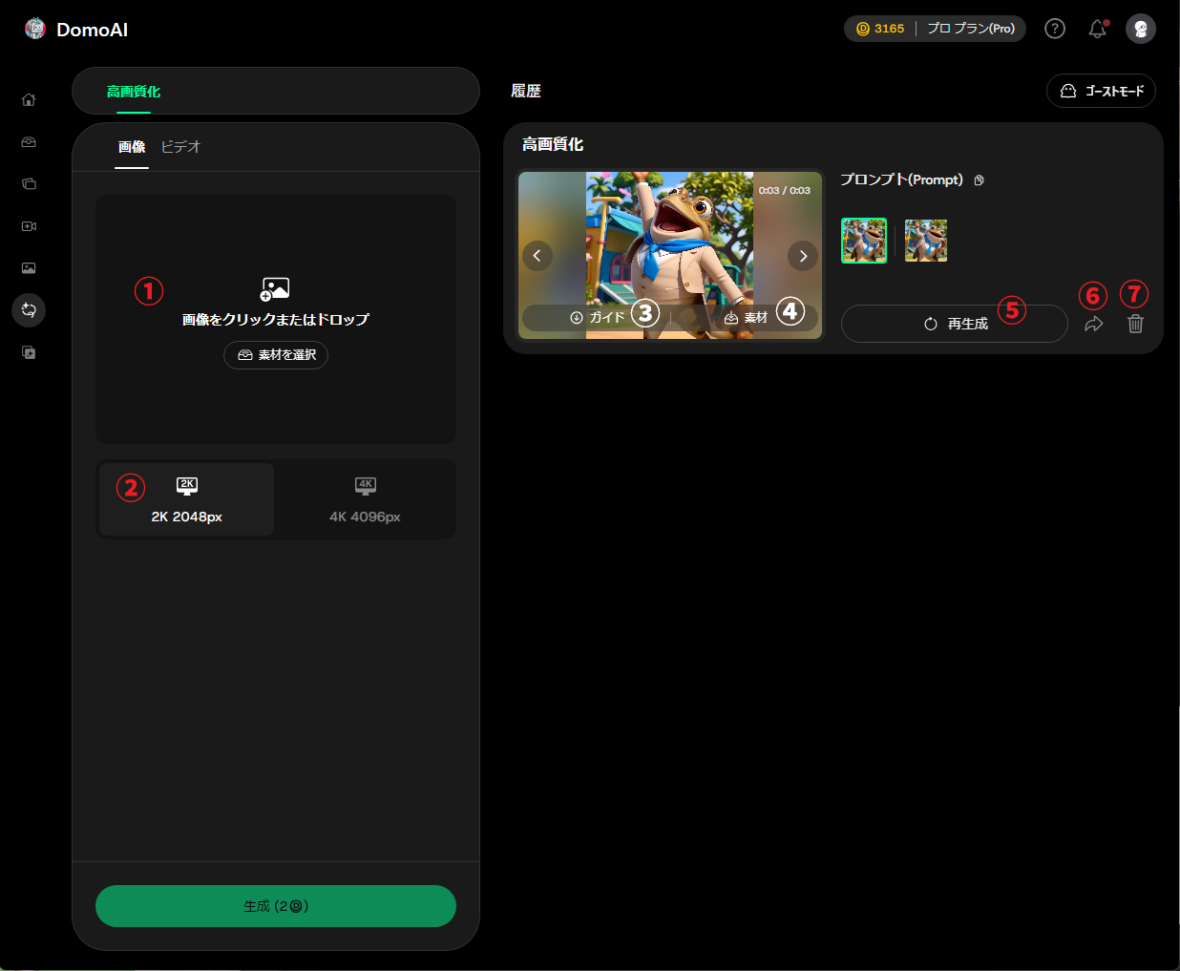 ②で画質を選択し、「生成」ボタンを押すと高画質化された画像が生成されます。