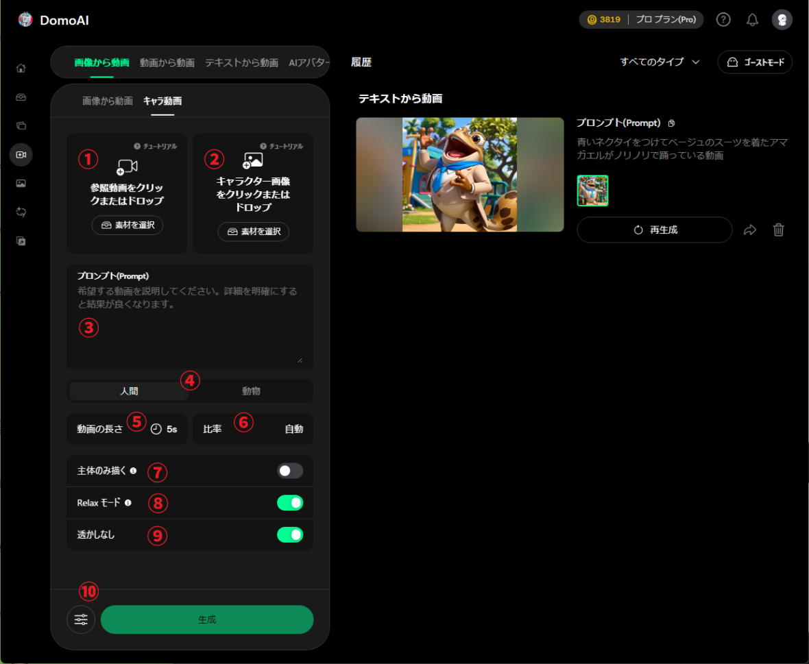 ⑦の「主体のみ描く」をOFFにし、「生成」ボタンを押すと動画の生成が始まります。