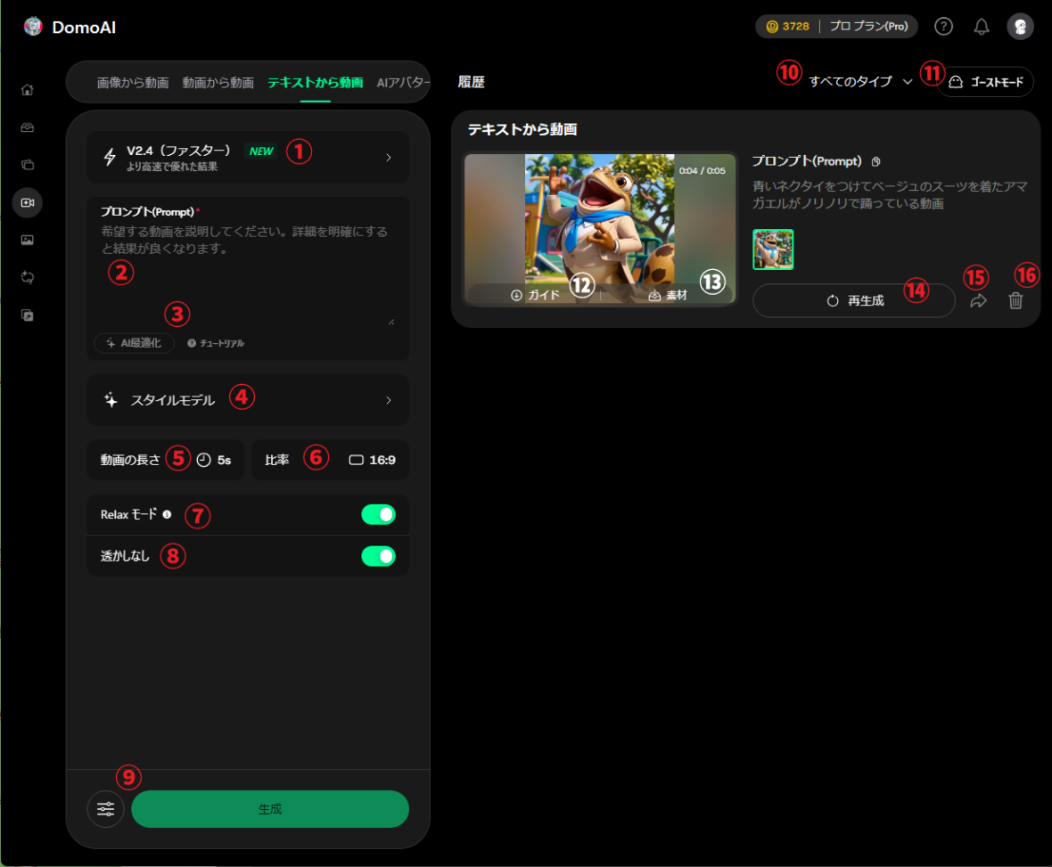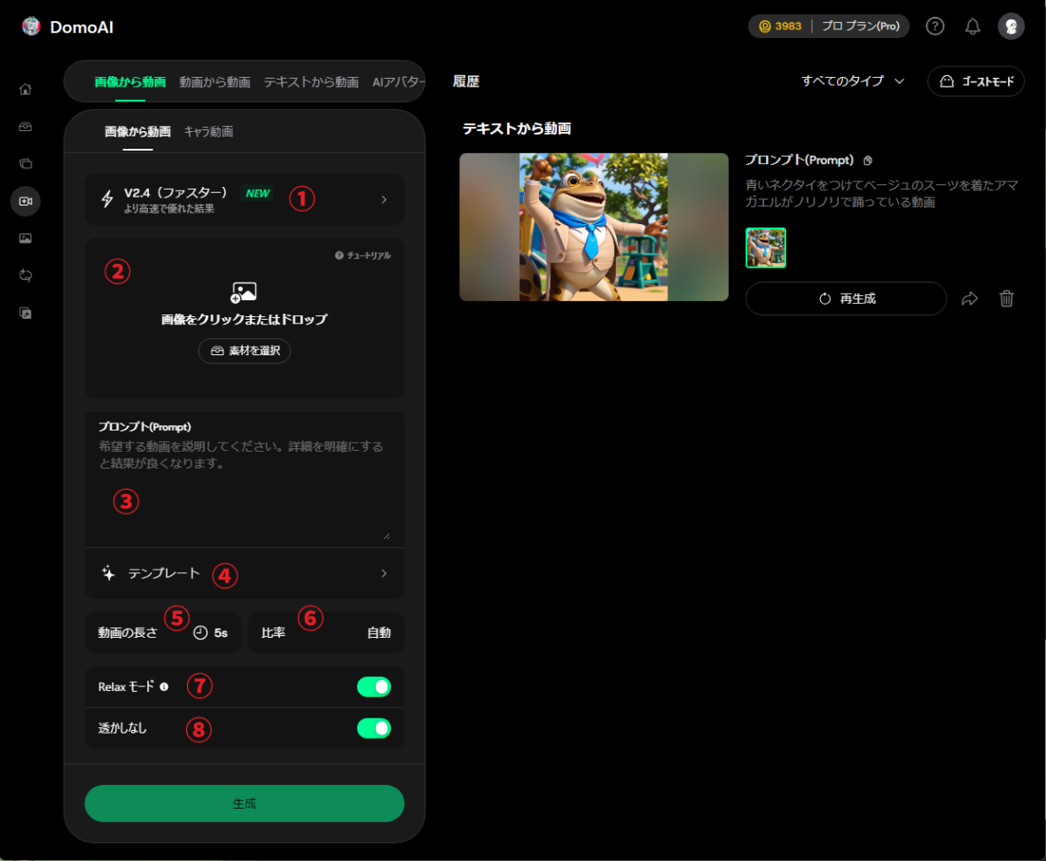 ②のプロンプトに生成したい動画の説明を記入し、「生成」ボタンを押すと動画の生成が始まります。